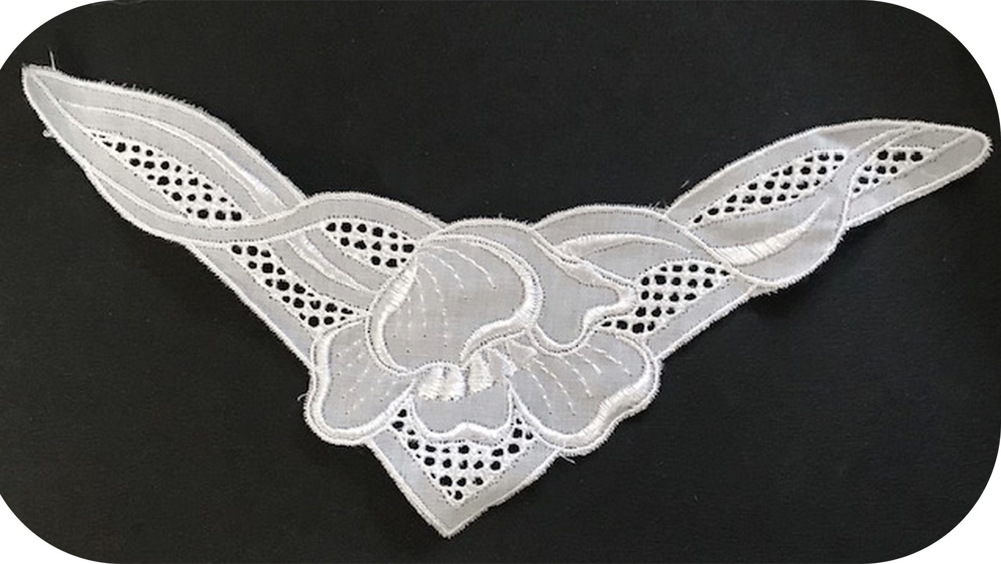Discover our White Embroidered English Broderie Collar, a must-have in our haberdashery. Ideal for enhancing all your creations. Available in stock, sold by the meter or piece depending on the type of product.