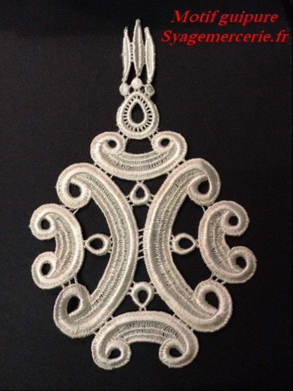 Discover our Ecru embroidered guipure lace motif, a must-have in our haberdashery. This refined lace is perfect for wedding dresses, elegant finishes, or haute couture creations. Sold by the meter.