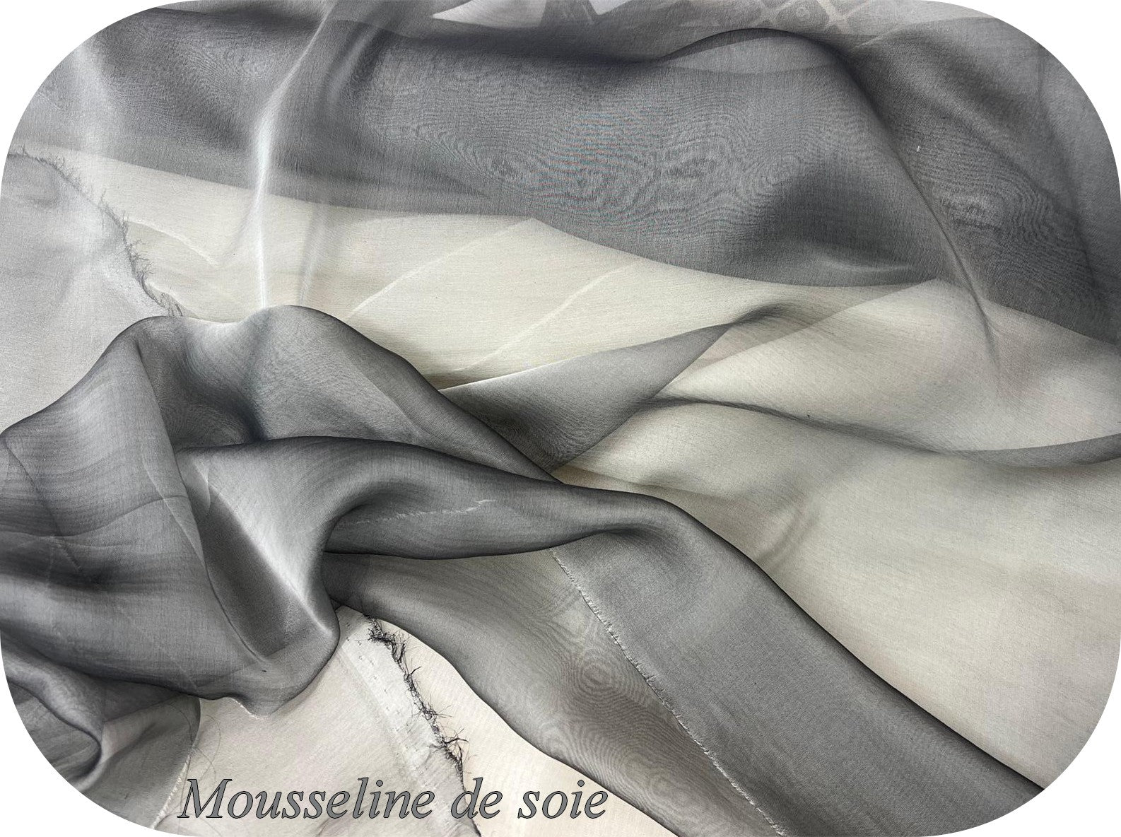 Découvrez cette mousseline de soie 100% pure aux reflets changeants gris et noir, un tissu d'exception provenant des maisons de haute couture parisiennes.