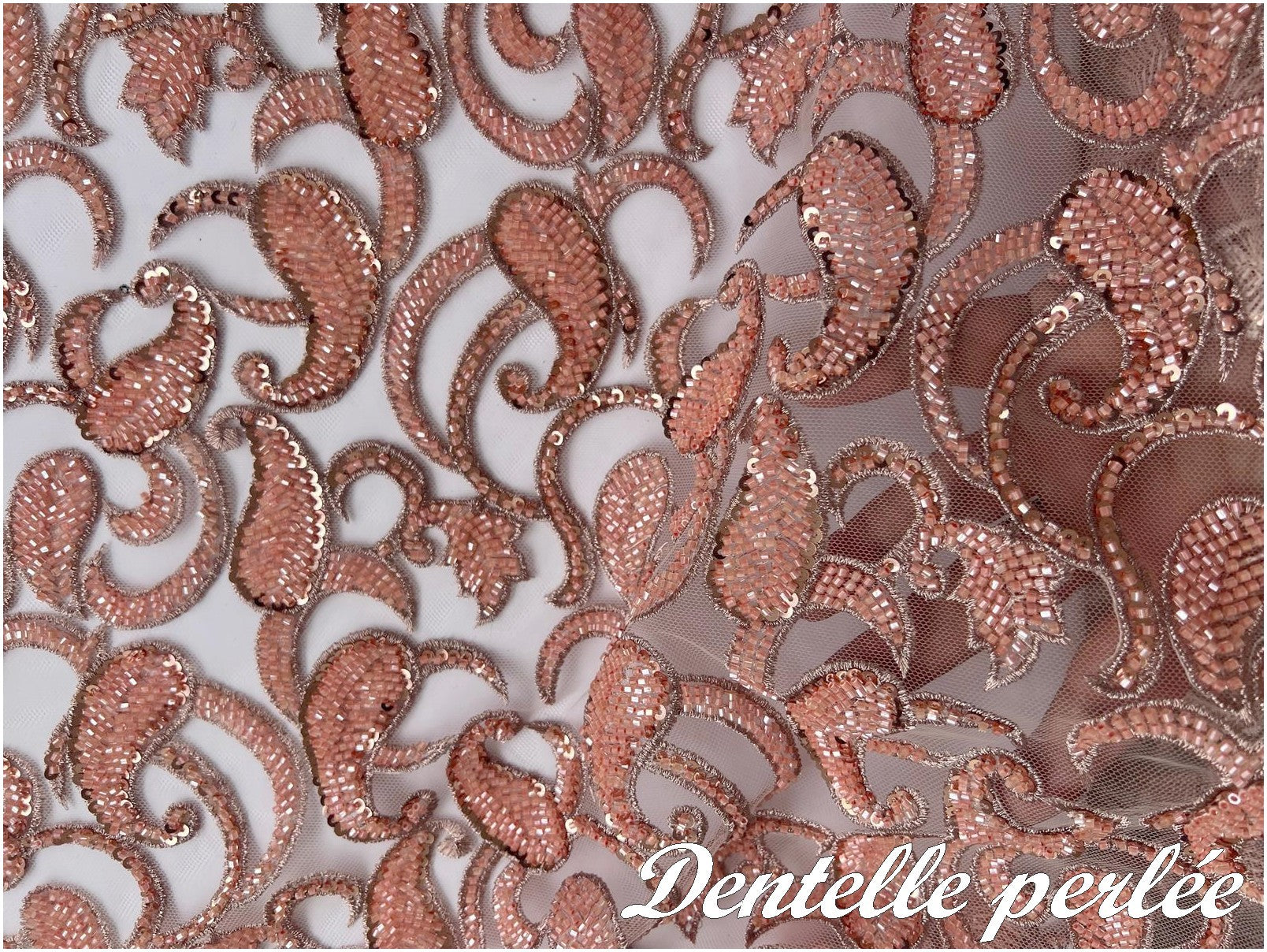 Encaje de cuentas salmón de alta costura por metros: "Elegancia en salmón: Creaciones exquisitas con tela de cuentas sobre malla"