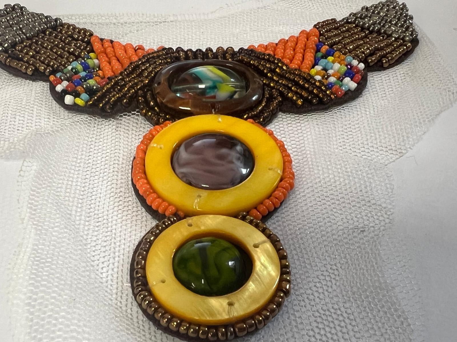 Chaque patch est minutieusement travaillé avec des perles de rocaille bronze et orange, rehaussées de touches multicolores (bleu, vert, blanc) et de cabochons en nacre et résine aux reflets jaunes et verts. Le motif ethnique aux ailes décoratives évoque les traditions textiles indiennes et bohèmes.